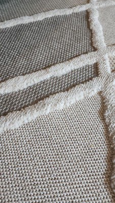 [This review was collected as part of a promotion.] The texture and contrasting colors in this rug add a little interest to my living room and go well with my colors. The rug is somewhat thin and I have a pad underneath it. I didn't notice any smell and the only issue I have had is the edge not laying down yet after about a week although I have not done much too remedy that. I would consider it somewhat and indoor outdoor type of rug with mostly a flat surface and a little bit of shag in the lines shown. Overall the rug is what I was expecting, the price was decent and I am happy with my purchase.