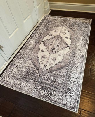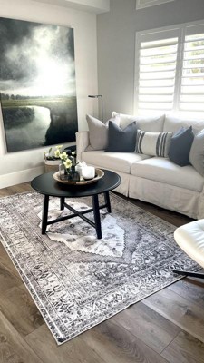 The rug was not gray it was brown & tans, arrived in a destroyed box and looks nothing like the photo. The material it was made of was thin and very scratchy from the stamped design. I’m grateful for free in store returns.
