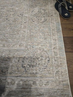 [This review was collected as part of a promotion.] The colors are perfect and exactly what I was looking for for. The color is overall more ivory than beige overal with patterns of teal, blue, gray and tan. The patterns are there, but distressed and not too busy. It's soft, but also a thin rug. I don't mind thin rugs especially because in have the 12x14.