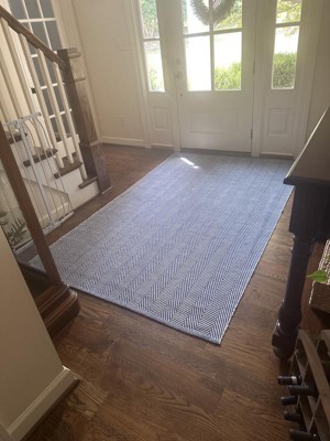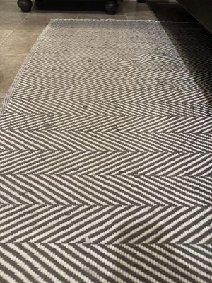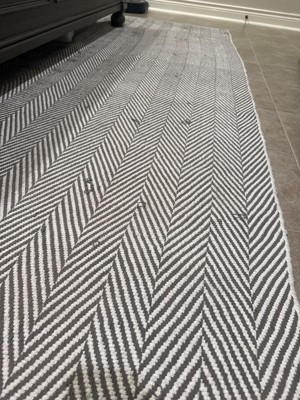 [This review was collected as part of a promotion.] This rug looks gray in the photo, but in reality it has gray and white stripes in the herringbone pattern (50% white). I would never have ordered a white rug had the photo been accurate.