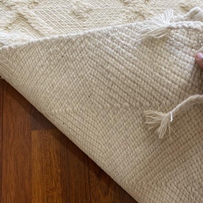 [This review was collected as part of a promotion.] I was so excited about this rug and it was rather basic. I think it looks very nice in the cream as people’s photos shows but the grey is just blah. It doesn’t lay very flat and tends to scrunch up. It’s not soft if that matters. I do like that it’s mostly wool. Ive only had it a few days and the tassels are already a bit snagged.