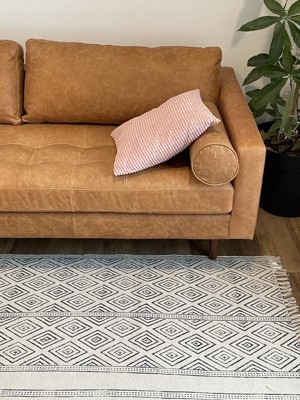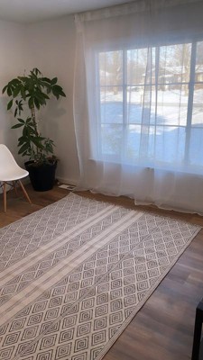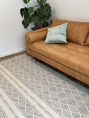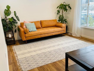 Gorgeous piece of craftsmanship all the way from india to my living room! Such a beautiful 100% natural , cotton hand printed in India. I was looking for something bohemian / contemporary yet geometric and this fits the bill! The whites are not 100% white but sort of off white. And minor stains just camouflage so well. It’s a flat weave and doesn’t have a thick pile height. So be aware of that. You might need a rug pad. I don’t use rug pad and I have hard wood floor and it’s just amazing to walk on. It fell flat within hours of unboxing and gives the perfect boho contemporary warm and cozy look to my living room. I’m already thinking of buying a few more similar rugs. My friends are complimenting me and it’s totally insta worthy. The customer service was super prompt before and after purchase to make sure that I’m happy with my purchase.