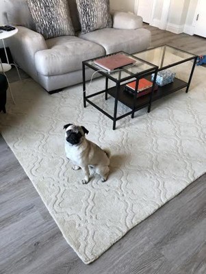 I was very nervous purchasing this rug as some reviews said it came with an odor, or would not stop shedding, or was itchy. Well, my rug is great!! It is soft and thick so sitting directing on it is no problem. It does leave some shedding, but it is a wool rug so I felt that was expected. I think after a few vacuums I think it will be just fine. It is more cream-colored than white/ivory, but it works great for my space!
