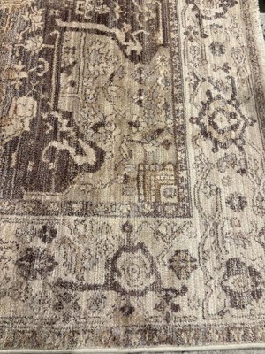 [This review was collected as part of a promotion.] The rug is a really nice pattern and neutral color, but like many of the other reviews, I wouldn't say the real life look of it matches the photos. There's kind of a mauve/plum tone to it but still nice and still goes with my room. It is thin, so don't get it without the rug pad. Also, the rug pad was a lot bigger than the rug so had to cut it down. which was a pain.