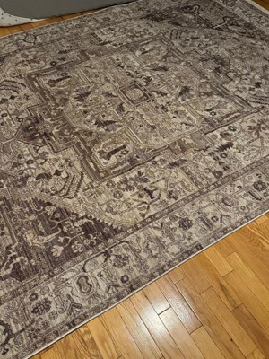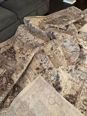 [This review was collected as part of a promotion.] The rug is a really nice pattern and neutral color, but like many of the other reviews, I wouldn't say the real life look of it matches the photos. There's kind of a mauve/plum tone to it but still nice and still goes with my room. It is thin, so don't get it without the rug pad. Also, the rug pad was a lot bigger than the rug so had to cut it down. which was a pain.