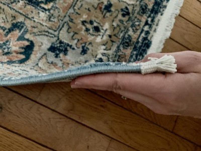 I really like this rug. The soft/smooth fabric is reallly soft on your feet. Its thin, but that works great for my entry way. The pattern hides any traffic dirt. For the first day I put some weight on the ends to get it to lay flat, but after a day it looked great. I would say the colors are brighter than the picture shows but in a good way. I do work for Target, but my opinions are my own.