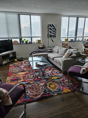 [This review was collected as part of a promotion.] This vibrant rug has every color in it that you can imagine. It is soft and shaggy. It brings a wonderful pop of color to my room.