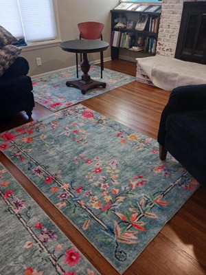 [This review was collected as part of a promotion.] The colors in the rug are bolder than I thought they would be. The blue color is what I thought would stand out the most but it is the colors of the flowers that you notice first. This rug is perfect for Spring and Summer but I was going to use it year around. I already got rid of my old rug. It is soft. I bought a 4 FT X 6 FT rug size and it fits nicely in my front loading washing machine. I bought 3 rugs of this size for my living room. The box it was shipped in was very flimsy. It had several holes in it that went through the box. The rugs were packaged well in a heavy duty plastic inside the box. Good quality rug. I have not washed it yet, but will follow the instructions that were packaged with the rug. The backing on the rug looks like it is a good quality.Rug pads are recommended. I have some rug pad scraps and just put 2 small scraps under them and they are staying put. The rugs were rolled. I had no wrinkles. Even though the rug is thin, the whole rug layed flat.
