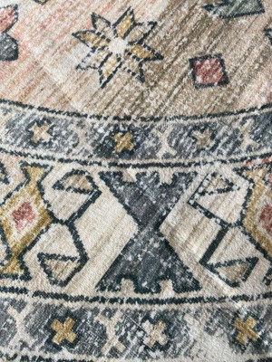 This rug is really pretty for the price. I would have given 5 stars but it came folded up and it is hard to get the creases out. Otherwise, I really like it and I like the worn look of the rug.