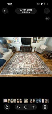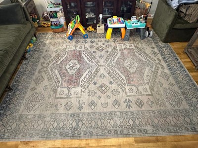 I really wanted a washable rug that wasn’t one I’ve seen 1000 times on Instagram ads and influencer videos. This one from rugs USA is a bold pattern with distinct colors without being super bright or distracting either. The blue is a kind of gray blue and the peach is an orangey beige. Also, no bright white (which im happy about because bright white tends to look dirty quickly). As the Big Lebowski said, “it really ties the room together!” We put this rug on top of existing “landlord special“ brown carpet so we didn’t need the rug pad, Though I would recommend a rug pad if putting this on a hard floor as it is a thin rug (which you would get no matter what if you’re ordering washable.)