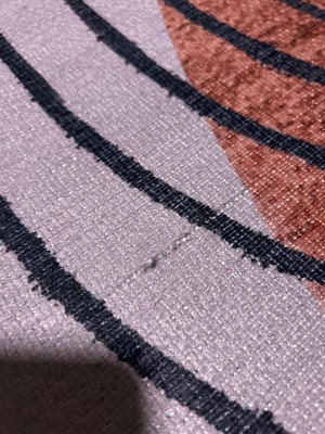 This rug isn’t worth it. The white looks gray and has a sheen to it. The terra cotta circle in the middle isn’t evenly colored and the black lines are so much thicker than they show in the photos. Additionally, there are imperfections as noted in the photos above and also has a slice in the material. This is a waste of time and money.