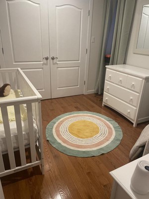 Love this rug, brightens up my nursery nicely! I added it on top of a washable white rug so I’d have a pop of color Bs not have to go crazy through the higher traffic area getting too dirty! Photo is before baby was born, it’s been used 4 months now and I haven’t noticed any shedding, washing to and will see how that goes!
