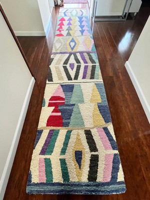 I always ask my husband before I make certain purchases what he thinks about them. When he saw the geometric rug he was overwhelmed with colors and surprised with me. We are black & white family. He knew I wanted it and he said you should get it. Something about the carpet made me happy. I recognized the Native American flare. I bought it as a runner for a basement floor which is very dark during the summer, but very cool and that’s our summer residence. The runner will brighten the place up. Quality wool. Only one thing- the colors weren’t as bright as the pictures, but still beautiful. Definitely recommend! Vicky V.