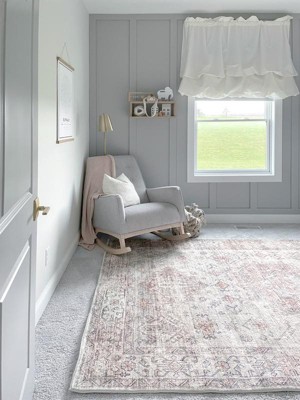 Unfortunately this rug is not anything like it’s pictured. Most reviews state the pink color but there was zero pink, or peach on the 2 I received. It was very soft and a beautiful rug but if your looking for pink this is not it. Really wanted this to work but it does not match at all. The customer service was amazing and helpful when dealing with return and replacement.