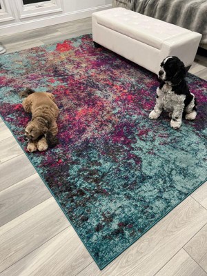 Make a bold statement with this abstract area rug. Made from durable synthetic materials, this floor covering is built to last while remaining soft underfoot in high traffic areas of your home. The unique blend of vibrant colors will elevate any room you place it in and will pair perfectly with any modern or bohemian décor. Create the home you’ve always dreamed of with our pet-friendly and easy to care for area rugs.