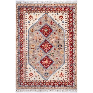 • A: The rug features vibrant patterns and fun wrapped tassels on either end.