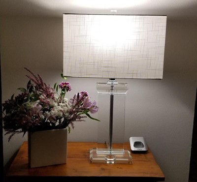 Let your room shine with the addition of this modern, 25-inch high, Crystal lamp. Its cotton shade delivers ambient lighting to an area. Add a vibrant flair to any room with its Clear finish. A rug pad is recommended to prevent slipping and to keep the rug lying flat in one place