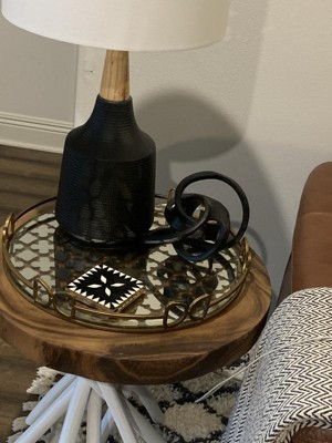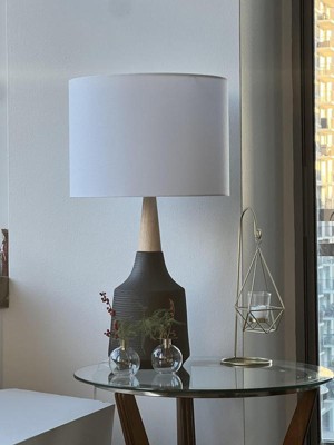 Let your room shine with the addition of this lavish 28-inch abstract table lamp. It has a Linen Drum shade that delivers bright ambient lighting. Adds a vibrant flair to any room with its black ceramic & wood finish. It has a 15-inch wide, ivory linen, drum lampshade that delivers soft lighting