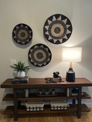 [This review was collected as part of a promotion.] Exactly what I was looking for to put on my sofa table. Perfect height. The black base has a few light taupey lines through it. The wood is slightly lighter than I thought it would be but it works well.