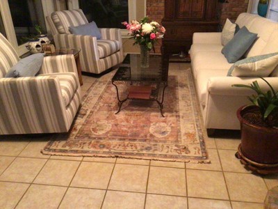 [This review was collected as part of a promotion.] I love this rug--the pattern, the colors, its softness. It's really a timeless rug. My only complaint is that the colors' brightness depends on the direction the threads are facing, so from one angle the colors look faded and from another the colors look darker and richer.