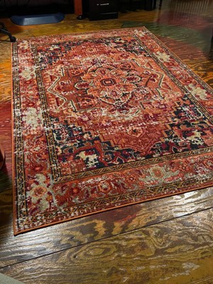 [This review was collected as part of a promotion.] I like it! Works great with the color scheme of my living room—the clever see how it looks in your room website trick did right by me. I was afraid the pretend "threadbare" antique design would be hokey in person or too busy, but it's not, in fact surprisingly perfect with my multicolor beat-up old wood floors. It's very pretty, and it doesn't have an icky cheap shiny nylon feeling—pleasantly surprised by the quality for the price, hopefully it will be long lasting. I've received a lot of "wow, love it" compliments from guests. About the color, as others noted the orange isn't all that orange—I was hoping for more bright orange—there is some true orange, but know that it is mixed with a lot of salmon/coral and magenta. It looks different in different times of day and light—it's lighter and pinker in sunny morning light, then richer, darker, more orange/red in the evening.