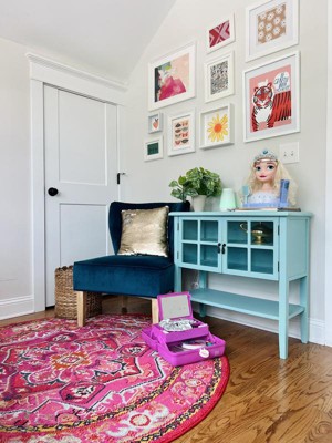 So cute in my daughters room; her room is an awkward shape and she wanted a pink/ colorful rug but a traditional area rug wouldn’t work. This is perfect to go under the front legs of her armchair so she still has a soft spot to play.