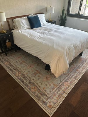 This rug is lovely! Very soft and very pretty. Looks much higher quality than the price! I would say the colors are warmer tones in person (white is more of a cream), but as you can see in the pictures, even though, it’s printed it looks woven. I have one crease I’m waiting to settle, but it otherwise flattened nicely out of the box. Has a sticky back, so I returned the rug pad I got. It’s a little thin - if I had it in a living room I might add a true cushier rug pad for comfort. I purchased the 7’6”x9’6” for under my queen bed and it fits perfectly. Would recommend to a friend or purchase again!!