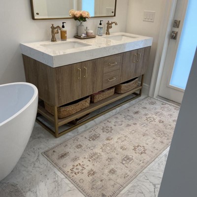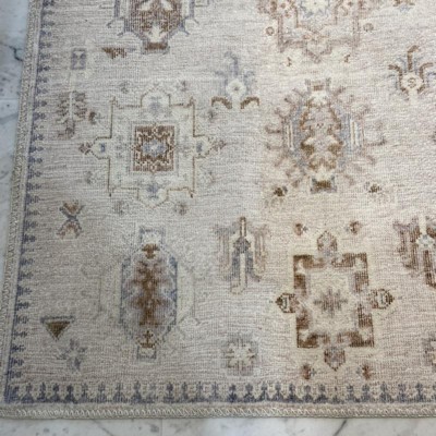 Looks like a vintage rug but perfect for a bathroom vanity since it’s washable! It’s very thin, no cushion at all. Microfiber type texture. Subtle blues and browns on a light grayish-beige. I love it so much that want 9x12 for my dining room now! Smaller sizes are shipped folded, just keep in mind the creases from folding will go away in a few days.