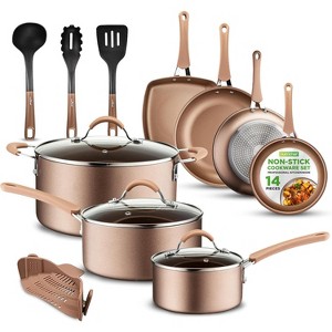 - 14-piece cookware set featuring non-stick pots and pans, perfect for home kitchens.
