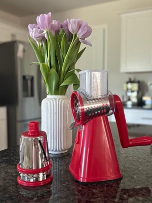 [This review was collected as part of a promotion.] This grater will help you safely and quickly shred, grate and cut all kinds of vegetables, cheese, nuts and more. Thanks to the simple use of interchangeable slices. Simply place the ingredients on the top of the grater and turn the handle and you'll be slicing ingredients in seconds! The handle requires a minimum speed to cut fruits, vegetables, cheese and more. Simply throw food into the top of the unit, turn the handle, and the ultra-sharp rotating blade cuts slices on the go - super fast!