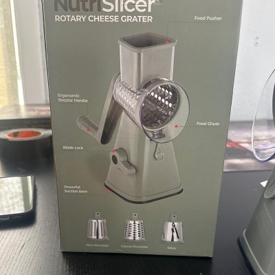 - NutriSlicer Rotary Grater Slicer For Vegetables and Fruits Includes: 1x NutriSlicer rotary Veggie Fruit Cheese Spiralizer with Suction Base 1x stainless steel slicing blade 1x stainless steel shredding blade 1x stainless steel grating blade