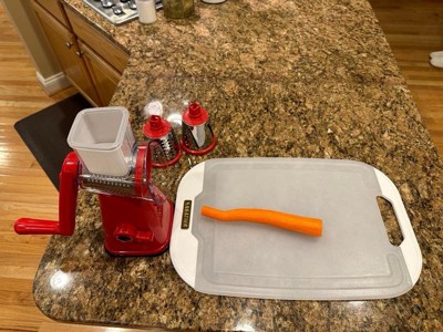 [This review was collected as part of a promotion.] Works great for shredding cheese and zucchini. It’s easy to store and is built well. This is way easier than hand shredding foods with a box grater.