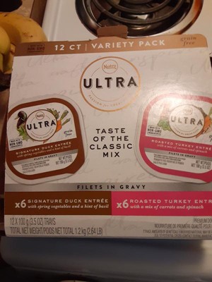 [This review was collected as part of a promotion.] The Nutro Ultra filet in gravy variety pack comes with 6 duck and 6 roast turkey entrées that are 3.5 oz each. The filet packs are both Non-GMO and grain free and both contain vegetables. I gave My English Mastiff 2 packets mixed in with his dry food but honestly he wasn't a huge fan or either the turkey or duck and didn't finished neither. I thought the food looked good, not sure why he didn't like it.