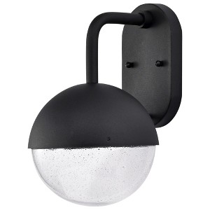 Collection: Atmosphere, Material: Aluminum, Finish Color: Matte Black, Width: 8", Height: 13.5", Depth: 9.5", Backplate Width: 8", Backplate Length: 1", Lamping Type: LED, Wattage: 6 Watts, Cri: 90, Color Temperature: 3000 Kelvin, Lumens: 550, Dimmable: Yes, Moisture Rating: Dry Rated, Desc: The Atmosphere 62-1615 LED large outdoor wall lantern makes a giant impact with its minimal design. The integrated LED module is housed within a sphere of matte black-finished metal and opal glass and is suitable for all exterior applications. The single-arm extends and curves downward, continuing the simple design surrounding this fixture. Fully integrated 10-watt LED Fixture measures 10 inch diameter x 16.5 inch height x 11.5 inch extends Rated for wet locations with full exposure Finished in matte black Mounting hardware and installation instructions included Limited three year fixture warranty. Rated Lifetime Hours: 30000 / Operating Temperature: -20C (-4F) to a maximum of +40C (+104F)