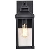 Collection: Corning, Material: Aluminum, Finish Color: Matte Black, Width: 6", Height: 15.75", Depth: 7.25", Backplate Width: 9", Backplate Length: 1", Lamping Type: Incandescent, Number Of Bulbs: 1, Wattage: 100 Watts, Moisture Rating: Dry Rated, Desc: The Corning 60-7371 outdoor medium wall lantern features an understated design and timeless style. The carriage-like appearance is enhanced with large clear glass panes, and pairs perfectly with a vintage-style bulb. A deep matte black finish showcases the subtle details on the fixture, housing, and backplate. Neutrality is at its finest and is suitable for a variety of home exteriors. Uses one 100-watt incandescent medium base bulb Fixture measures 6 inch width x 15.75 inch height x 7.25 inch extends Rated for wet locations with full exposure Finished in matte black with clear glass Mounting hardware and installation instructions included Limited one year fixture warranty. Back Plate Height: 1.00 / Back Plate Width: 9.00 / Sha