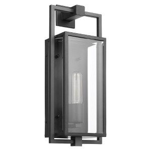 Collection: Exhibit, Material: Steel, Finish Color: Matte Black, Width: 7", Height: 17", Depth: 4.5", Backplate Width: 11.46", Backplate Length: 0.59", Lamping Type: Incandescent, Number Of Bulbs: 1, Wattage: 60 Watts, Moisture Rating: Dry Rated, Desc: With great attention to detail and superb styling, the Exhibit 60-7544 medium outdoor wall lantern is the ideal solution for your outdoor lighting needs. The floating rectangular frame and box are finished in matte black to complement existing finishes and decor. The clear beveled glass panels give an unobstructed view of the light source providing optimal illumination. Pair with a vintage-style bulb to add a touch of charm to this stylish fixture. Uses one 60-watt incandescent medium base bulb Fixture measures 7 inch width x 17 inch height x 4.5 inch extends Rated for wet locations with full exposure Finished in matte black with clear beveled glass Mounting hardware and installation instructions included Limited one year fixture