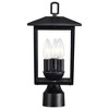 Collection: Jamesport, Material: Glass, Finish Color: Matte Black, Width: 7.5", Height: 15.25", Length: 7.5", Depth: 7.5", Lamping Type: Incandescent, Number Of Bulbs: 3, Wattage: 100 Watts, Dimmable: Yes, Moisture Rating: Wet Rated, Desc: Like many hamlets, the Jamesport Outdoor Collection transcends conventional style to suit many homes architectural styles. Designed with large clear glass panels, it brings light from all sides for optimal illumination. The finely constructed die-cast aluminum framework with its subtle matte black finish perfectly complement its structured simplicity. Present your guests with the inviting and welcoming Satco #60-5932 post light as they approach your entry way. Accepts three 100W candelabra E12 base bulbs / Die-cast Aluminum Construction / Clear Glass / Matte Black Finish / Dimensions: 15.25 inches high x 7.5 inches wide x 7.5 inches long / Wet Location Rated / 1 Year Warranty / Easy to install with included instructions and mounting hardware. Pier