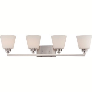 Collection: Mobili, Material: Glass, Finish Color: Brushed Nickel, Width: 34.63", Height: 7.88", Depth: 6.88", Number Of Bulbs: 4, Wattage: 100 Watts, Dimmable: No, Moisture Rating: Damp Rated Desc: Mounting Direction: Up/Down / Shade Included: TRUE / Warranty: One Year. , Material: Glass, Finish Color: Brushed Nickel, Width: 34.63", Height: 7.88", Depth: 6.88", Number Of Bulbs: 4, Wattage: 100 Watts, Dimmable: No, Moisture Rating: Damp Rated