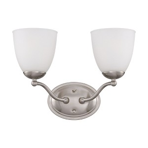 Collection: Patton, Material: Metal, Width: 15", Height: 11", Depth: 7", Number Of Bulbs: 2, Wattage: 100 Watts, Moisture Rating: Damp Rated, Desc: The classically inspired Patton series finished in brushed nickel or prairie bronze and accented by frosted glass shades, is the largest and most versatile of our new design collections. In addition to the usual configurations, Patton features a 4-light vanity, a flush dome and 3 and 5-light chandeliers which are available in both arm-up and arm-down configurations. There is nowhere these fixtures cannot go. Rated: Damp.,