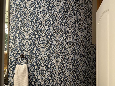 Flowers and forest animals combine to create this whimsical damask design. The navy blue backdrop and white details add a charming feel to its Scandinavian print. Navy Escape to the Forest Peel and Stick Wallpaper comes on one roll that measures 20.5 inches wide by 18 feet long. Peel and stick NuWallpaper goes up in minutes and comes down in seconds! Printed on a premium substrate that is completely removable and will not damage walls, this new peel and stick wallpaper solution saves you both the time and money of ordinary wallpaper. Simply peel and stick to create a gorgeous look on any smooth, flat surface.