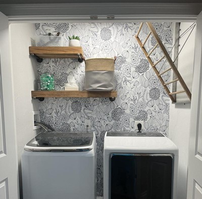 The pattern is beautiful , it’s not sticky at all, I had to go buy ez hang to get it to stick to my walls, other than that I love it! I was reading people say not easy to match up, one thing I’ve learned in wallpaper is to look past the imperfections no one will notice except you. Once you look past trying to perfectly match up the wallpaper, it makes the job that much easier. Love how my laundry room came out! I rated four stars because it wasn’t sticky enough.