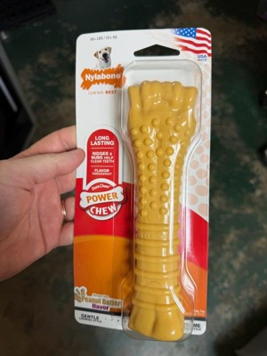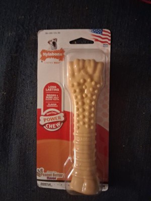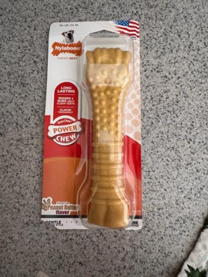 [This review was collected as part of a promotion.] Nylabone knuckle Dog bone x large peanut butter holds up to the most aggressive chewing. My pit bull chew through most bones but he loves this one and it's still here after a week of chewing.