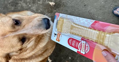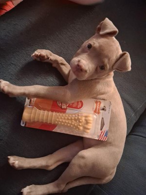 [This review was collected as part of a promotion.] My dogs gave this Nylabone 5 stars! They were very excited when I gave it to them and my boy Bruno claimed it for himself. He loves peanut butter so the flavor was perfect for him. He is a pretty aggressive chewer since he is still young. These hold up well to him chewing non stop. I prefer these to rawhide since they are safer with nothing to ingest. They help keep him out of trouble because he’s chewing what he’s supposed to and not my stuff.