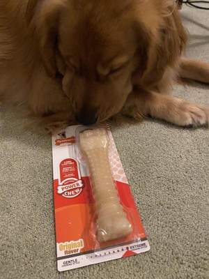 [This review was collected as part of a promotion.] I received this item in exchange for an honest review. I have a large dog and an extra large dog who both love to chew so i chose the largest nylabone option. I like this bone because my dogs cannot break off pieces like the way they can with a natural bone which is very dangerous with dogs like mine who are power chewers. The bone is covered in diffetent textured bumps to keep my dogs teeth clean and it has a scent which my dogs enjoyed. They stay occupied for long periods of time and seem to love this new nylabone. I will definitly buy more of these.