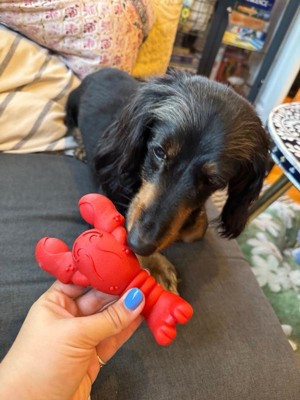[This review was collected as part of a promotion.] This toy was way harder plastic than I expected it to be for some reason, but I’m hoping that means it’s extra durable! You can definitely smell the filet mignon flavor (not my favorite smell). I do like the shape of the lobster a lot because it gives my dog a place to hold onto it and chew.