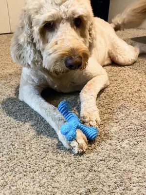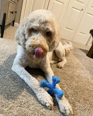[This review was collected as part of a promotion.] We got this toy about a week ago and it has become our dog Chief’s newest obsession. The other night I walked in and he had actually fallen asleep with it in his mouth. Chief is an 80lb Goldendoodle and he can chew through most anything. This toy is showing a little wear after a week but I’m surprised at how little that wear actually is. It is beef flavored which Chief seems to love. And best of all I am yet to find any shards from the toy anywhere in the house. High quality toy and I, and Chief, are very pleased with it.