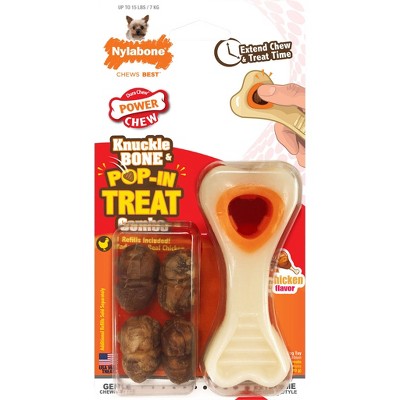 The Puppy Chew Toy and Treat Starter Pack includes a soft, chicken-flavored Puppy Bone for teething puppies, a Power Chew DuraChew chicken-flavored bone for puppies starting to get their permanent teeth, and a Healthy Edibles lamb & apple puppy treat just for puppies 6 months and older. Chew toys and treat made in the USA.