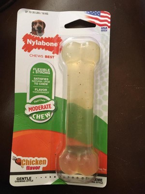 [This review was collected as part of a promotion.] I bought chicken flavored Nylabone for my pooch because he loves chicken.. the bone is f look exhale and strong and satisfied he needs for chewing. It also cleans teeth and fresh hff ens breath. I definately would recommend.