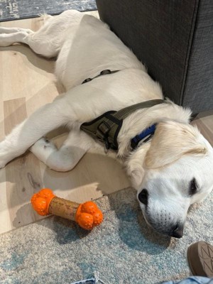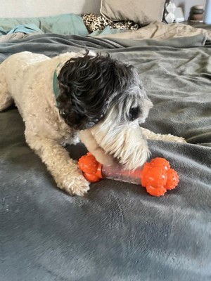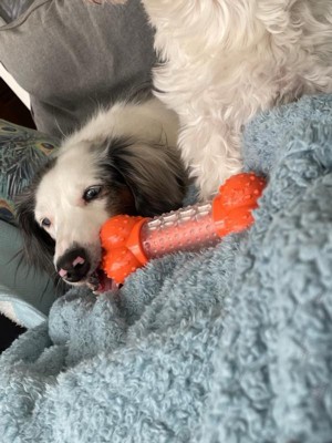 [This review was collected as part of a promotion.] Holly smokes this bone toy is durable ! It’s the perfect size for my Eskimo spitz and kept her busy. For hours and that’s hard for her she couldn’t figure why she couldn’t just bite through and get the food or treats !! The design makes it safe and easy to fill it and allow your dog to play safely! Now we took it away after she got all the treats out about after a hour bc I didn’t want her to try and end the bones life lol! But ten paws 🐾 up in this house!! Xo