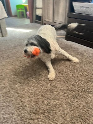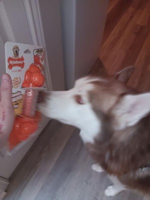 [This review was collected as part of a promotion.] My dog immediately went to town on this toy. It is easy to use and fill. It is easy to clean. The only issue for me was that it was too hard for my pup. If there is a softer version, it’d be perfect.